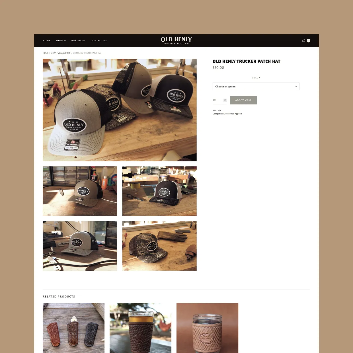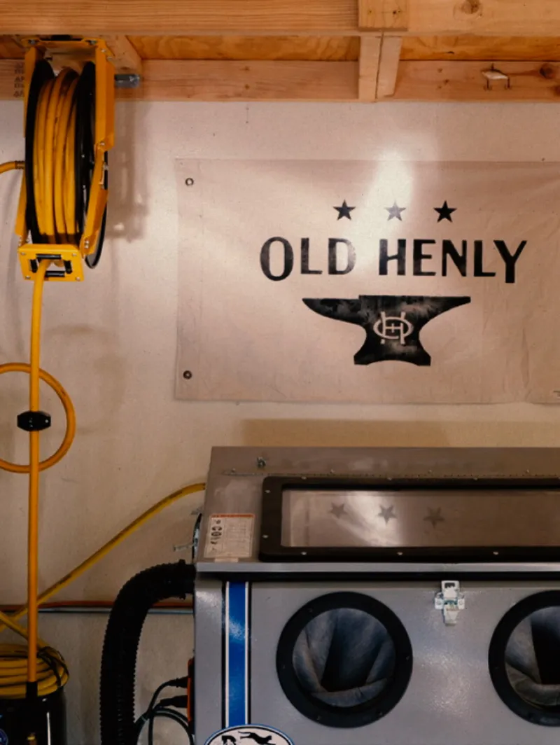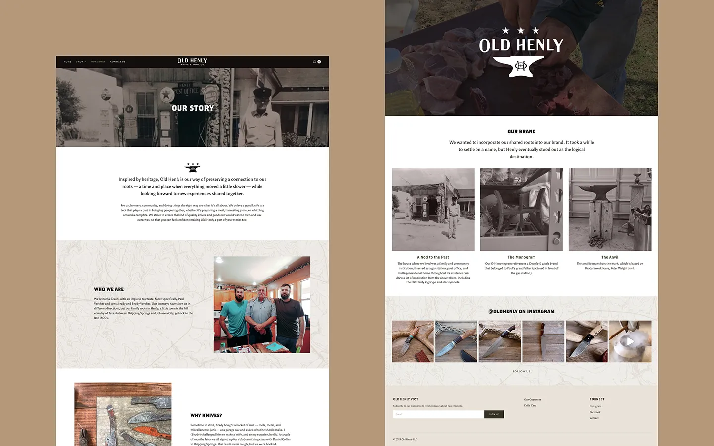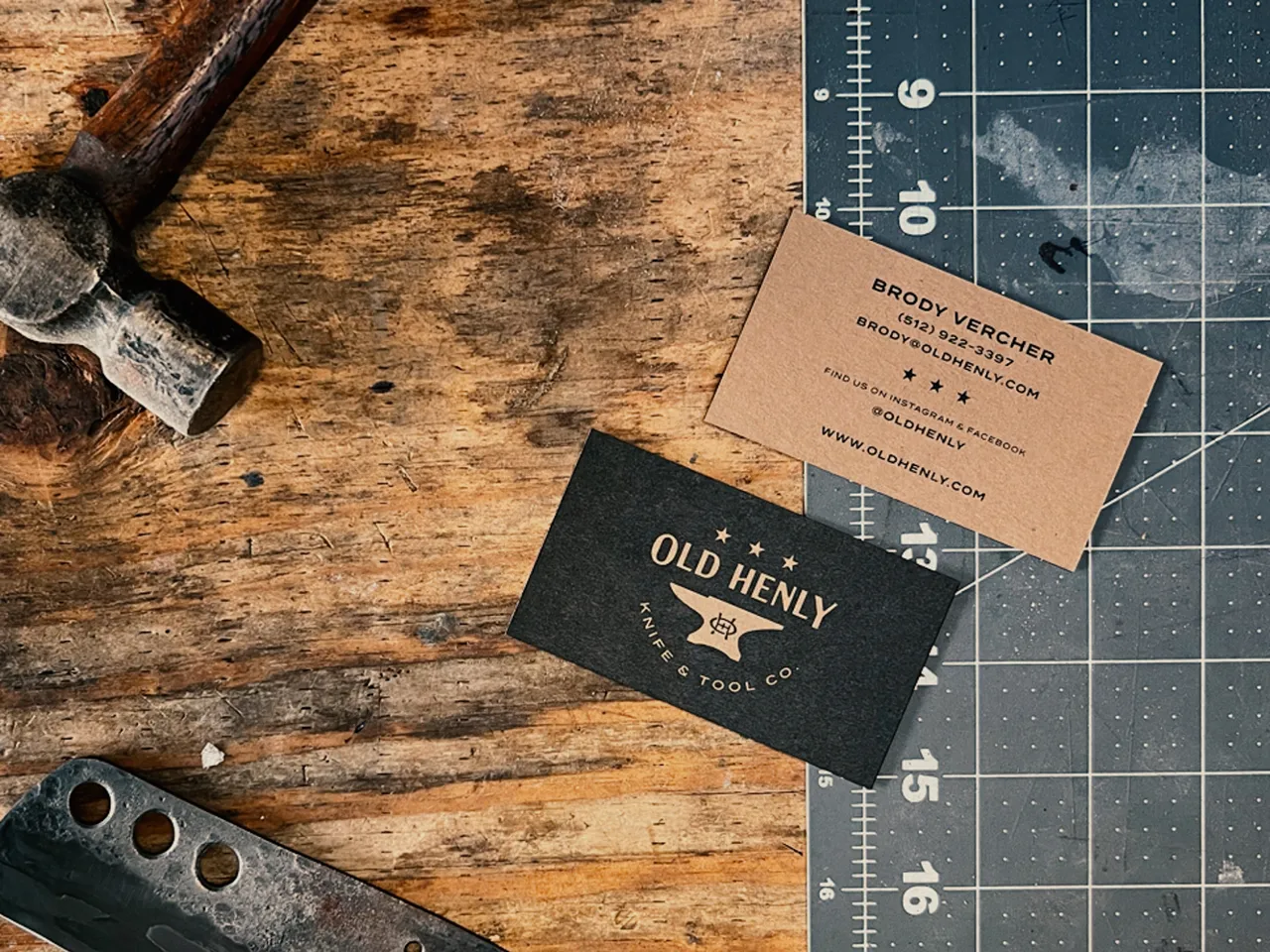 Initially, the knives were made and given away or sold with no identifying marks on the blade. Before creating a mark that could be etched or stamped, the company needed a name. Several ideas were considered and after a lot of deliberation, Old Henly stood out as the logical destination. Henly is a little town in the hill country of Texas between Dripping Springs and Johnson City where the founders share roots. With “old” in the company name, we leaned on history when creating the identity.
